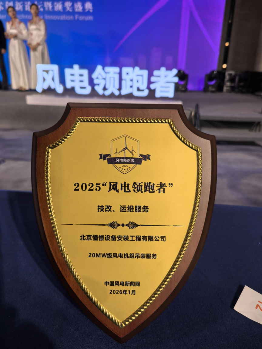 2026年1月8日,由中国风电新闻网、每日风电、风电智库主办2025(第五届)“风电领跑者” 技术创新论坛暨颁奖盛典在北京举行,憧憬吊装凭借优质的服务一举摘得20MW级风电机组吊装服务技改、运维服务奖,憧憬吊装将秉承做办实事有温度的受人尊重的吊装公司的精神,继续为业主和厂家提供安全高效优质服务。